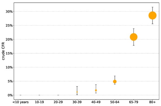 Out of 421 deaths, 89.1% (375 deaths) belonged to the 65+ age group. As seen in Figure 4, the highest crude CFR was observed in the 80+ age group (28.6%), followed by the 70–79 age group (22.4%) and the 65–69 age group (17.3%). No deaths were reported under 33 years of age, see Figure 4. Additional details are provided in Table 6.