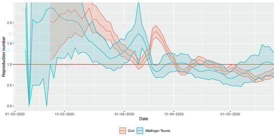 For a discussion on the relative merits of these two approaches, see [21,22]. The Wallinga–Teunis method was used with the addition of Cauchemez et al., who aimed to provide real-time estimation capability [23].
