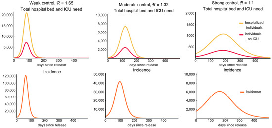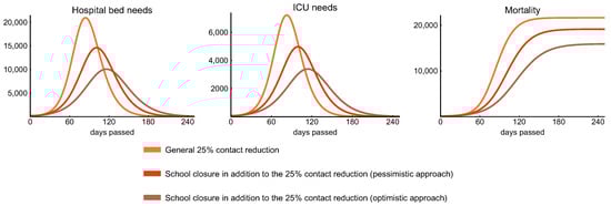 The peak ICU demand crucially depends on two factors: the probabilities of developing severe disease, and the shape (in particular the peak size) of the epidemic curve. We plotted a heatmap of the peak ICU demand in Figure 14, compiled from hundreds of numerical simulations. Transmissibility (vertical axis) is expressed by the reproduction number . Disease severity, for simplicity, is expressed by the IFR. In fact, here we used a scaling factor for the probability of hospitalization, with the baseline corresponding to the parameters in Table 3. In our weak control scenario (Section 3.3), the IFR is 0.4%, which is a bit lower than the finding of [58]. However, during the first wave in Hungary, the schools were closed and COVID-19 disproportionately affected the vulnerable population. In our scenarios, we assume a widespread community spreading, hence younger generations appear in higher numbers, thus the IFR is expected to be smaller. In any case, by the scaling of the hospitalization rate (while leaving the probability of intensive care and fatal outcome given hospitalization intact), we explored a wider range of IFRs. We found that indeed the peak ICU demand can vary across a large interval. From the shape of the level curves in the heatmap, we can conclude that the peak ICU demand is more sensitive to than to the IFR, hence flattening the curve is indeed of utmost importance to avoid exceeding healthcare capacities.
