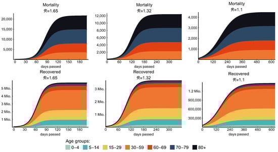 The governing system of differential Equation (1) of our model can be found in Section 2.3.1. The model parameters with references are detailed in Section 2.3.2. A further important component of our model is the contact matrix, describing social mixing between the age groups, which can be found in Section 2.3.3. The elements of the contact matrix are included via the different transmission terms . Reproduction numbers are calculated using the next generation matrix method in Section 2.3.4. We discuss the application and, then, some limitations of this model in Section 2.3.5 and Section 2.3.6, respectively. The codes were implemented in Wolfram Mathematica and are available at [49].