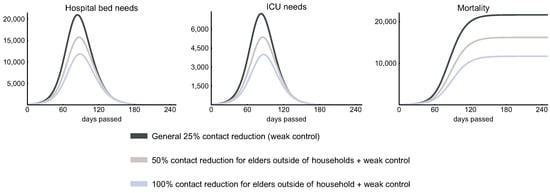 For an uncontrolled epidemic in the UK, Ref. [41] estimated a peak in ICU bed demand more than 30 times greater than the maximum capacity in these countries. In a study for the United States, Ref. [42] projected that, at the outbreak peak, three times more ICU beds would be needed than the total number of ICU beds in the US, and 85% isolation of cases reduces the demand for ICU beds to the normal capacity. In the Île-de-France region, Ref. [39] estimated that the peak number of ICU beds needed would exceed more than 40 times the regional capacity if no strategy is implemented after lockdown, and only efficient case-finding and isolation applied parallel with social distancing could decrease ICU demand below the maximum capacity throughout the epidemic. For Australia, Ref. [38] studied three capacity expansion scenarios (2, 3 and 5 times expansion, respectively), and, even in mitigated scenarios, demand is estimated to be higher than the number of available beds. Additional social distancing measures were shown to reduce the epidemic to a level where a reasonable expansion of ICU capacity can be sufficient.