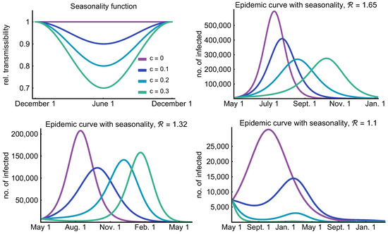 by which we scale the transmission rate . Parameter c denotes the magnitude of the effect of seasonality on the number of contacts. Using such a time-dependent transmission rate, we compare possible disease dynamics generated by the interplay of control measures with different degrees of seasonal behavior.