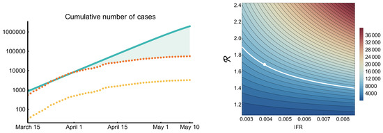 The most important implemented measures are summarized in Table 9. To assess their impact, we compared the reported case numbers adjusted by the ascertainment rate 1:17 to the simulated outbreak curve with (Figure 14 on the left, logarithmic scale). Here, we assumed that the ascertainment rate did not change in time, which may not be the case. One can see that the epidemic was on the trajectory, which could have resulted in substantially more infections. The data shows a clear deviation from this scenario early April, two weeks after strict social distancing started. The slope of the epidemic curve further decreased mid-April, following the stay at home measures by two weeks.