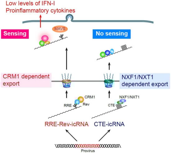 Cells are equipped with numerous nucleic acid sensors to detect cytosolic viral RNAs. Well-characterized sensors include retinoic acid-inducible gene I (RIG-I)-like receptors (RLR) family members, RIG-I and MDA5 (reviewed in [,]), which recognize non-self single- and double-stranded RNA with an uncapped triphosphate group at the 5′ end and elicit robust IFN-I responses by inducing MAVS activation. While transfection of purified HIV RNA can induce RIG-I-dependent IFN-I responses [,], whether RIG-I can sense de novo transcribed HIV RNA upon infection remains unclear. We and others demonstrated that post-transcriptional HIV replication steps trigger innate immune responses in macrophages [,]. In particular, we showed that HIV RNA, and specifically intron-containing RNA (icRNA), induces MAVS-dependent IFN-I responses in MDMs, resulting in pro-inflammatory cytokine production and ISG upregulation (Figure 2) []. HIV RNA is transcribed as a ~9-kB fragment and undergoes splicing events similar to cellular mRNA, leading to synthesis of early viral protein products, Tat, Rev and Nef. Upon accumulation of Rev, icRNA (unspliced RNA or singly-spliced RNA) can be exported into cytosol in a Rev-RRE-CRM1-dependent manner (reviewed in []). Recent studies by us and others suggest that inhibition of HIV icRNA nuclear export alone attenuates induction of pro-inflammatory responses in HIV-infected MDMs [] and dendritic cells []. Interestingly our studies also suggest that route of HIV icRNA nuclear export, specifically CRM-1 dependent pathway, is important for triggering cytosolic nucleic acid sensing mechanisms, since CTE (constitutive transporting element from Mason–Pfizer monkey virus [])-dependent alternative nuclear export pathway (NXF1/NXT1-dependent pathway) failed to induce pro-inflammatory responses in MDMs. Importantly, cytosolic expression of HIV icRNA induced innate immune responses via MAVS, but MAVS activation was independent of RIG-I or MDA5 []. Increasing evidence suggests a non-redundant role for host RNA surveillance and degradation mechanisms such as nonsense-mediated decay and RNA exosomes in controlling foreign RNA and aberrant host-derived RNA (reviewed in []). Future studies are needed to elucidate molecular mechanisms of how host RNA surveillance mechanisms distinguish foreign RNAs such as HIV-1 icRNA from host-derived RNAs and identify the cytosolic RNA sensor that detects HIV icRNA in myeloid cells.