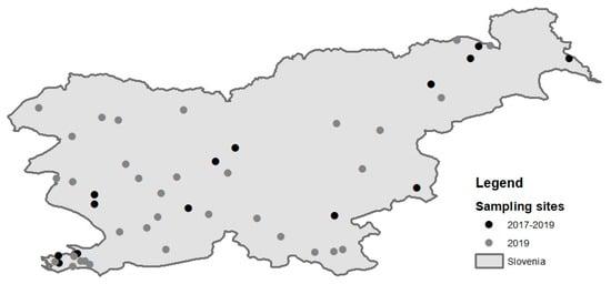 Mosquito sampling locations in Slovenia. Black dots represent sampling locations in years 2017–2019; grey dots represent additional locations sampled in 2019.