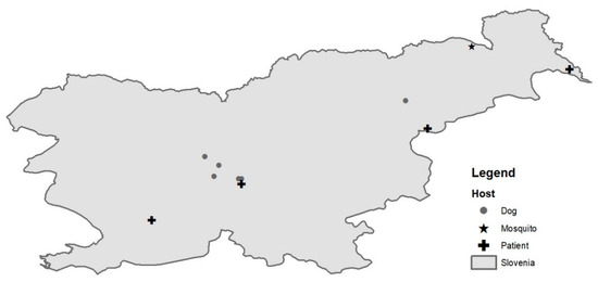 A map of geographic distribution of West Nile virus (WNV) positive patients (cross), mosquito pool (star) and dogs (point) identified in Slovenia in 2018.