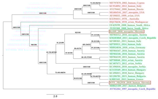 A phylogenetic analysis was performed with IQ-TREE using ultrafast bootstrap approximation [23] under the GTR+F+R2 model (chosen by ModelFinder [24]) on all available full length WNV genomes available in the GenBank on the 25 March 2019. For better visualization of a phylogenetical relatedness of Slovenian WNV strains, a subset of 28 genomes, with emphasis on geographic closeness of the origin countries, was chosen for Figure. Lineage are color coded: red, lineage 1; green, lineage 2 and blue, lineage 3. Both Slovenian isolates (circled in red) belong to the virus lineage 2. The mosquito pool (Ko169/18; GenBank no. MK947396) is phylogenetically closer to the strains circulating in Austria and Czech Republic. The human isolate (NK2950; GenBank no. MK947397) is most closely related to the WNV strain circulating in Hungary in 2017. The first value on the branches represents SH-like approximate likelihood ratio test result in % [25]; second value approximates Bayes test result in % [26], and third value is ultrafast bootstrap approximation [27]. The bar in the legend represents the number of nucleotide substitutions per site alongside the branches.