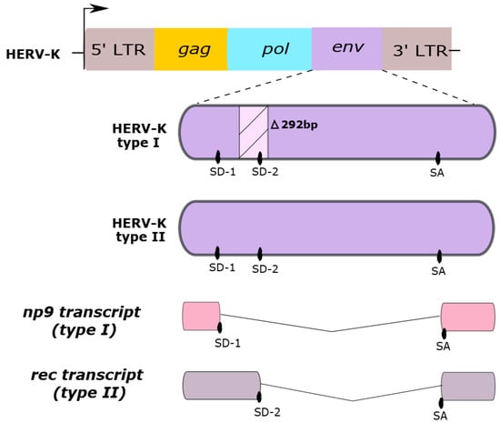 HERV-K HML-2 subtype sequences are classified as type I or type II, according to either the absence or presence of a 292-base pair portion in the env coding region, as shown in Figure 1. While type II sequences are able to produce the viral accessory Rec protein, type I sequences cannot produce the Rec protein but are instead able to synthesize an alternative protein, called Np9. Both Rec and Np9 proteins have been postulated to be involved in carcinogenesis [3,19,36,40,41,42].