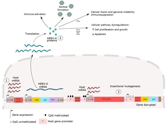 Many studies have discussed the mechanisms of carcinogenesis mediated by HERV-K expression, as shown in Figure 2 [2,12,67]. However, whether HERV has a role in cancer initiation or cancer progression is still controversial. HERV-K insertional polymorphisms, responsible for HERV haplotype diversity in the human population, can influence disease susceptibility, including cancer [40,68,69,70,71]. HERV-K LTR sequences are able to up- and downregulate host genes [72]. Host gene expression dysregulation, such as that of oncogenes, proto-oncogenes and growth factors has been reported in cancer and has been associated with HERV LTR promoter activity [35]. These sequences may influence the expression of neighboring host genes and act as alternative promoters or enhancers of host genes [35,73,74]. For example, hypomethylation in LTR promoters is able to induce carcinogenesis in B cell-derived Hodgkin’s lymphoma by deregulating the expression of the colony-stimulating factor 1 receptor (CSF1R), a proto-oncogene [75]. In addition, despite the high HERV-K expression in cancer, de novo insertion by re-infection events has not been detected, which is not surprising since no HERV-K copies are known to be retrotransposition competent.