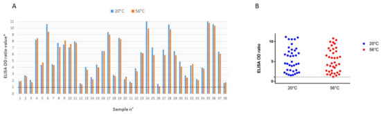 Impact of heat treatment at 56 °C-30 min on the SARS-CoV-2 ELISA EuroImmun IgG assay compared with the same sera maintained at ambient temperature (20 °C). Panel (A), histogram representation. (B): point cloud representation. Positivity threshold is represented by the discontinuous line.