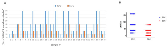 Impact of heat treatment at 56 °C-30 min on the SARS-CoV-2 neutralization assay compared with the same sera maintained at ambient temperature (20 °C). Panel (A), histogram representation. (B): point cloud representation. * Serum specimens with a titer ≥ 20 were considered positive.