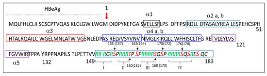 HBc primary sequence. HBc sequence starts at position M1. The upstream 29 residue sequence corresponds to a peptide signal that drives the translocation of the 25 kDa precore protein into the ER lumen, leading to the synthesis of a secreted form of the core protein, named HBeAg [23]. The N-terminal domain (NTD) corresponds to residues 1–140. Rectangles delineate the five alpha-helices of NTD found in NTD monomers that are essential for HBc to assemble in the icosahedral capsid [24]. The next ten residues contain the PPXA sequence found in various viral proteins to hijack the Endosomal sorting complexes required for transport machinery (ESCRT) [25,26]. This flexible sequence was recently confirmed to be essential during HBV replication. The C-terminal domain (CTD) contains arginine residues (in green) required for the interaction of HBc with nucleic acids (NAs), an activity that is regulated by the phosphorylation of the seven serine/threonine residues (in red), even though S 155, 162 and 170 are considered as the three major phosphorylation sites (residue numbers of S or T in brackets, genotype A).
