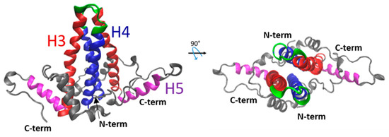 The structure of the NTD capsid has been solved by X-ray crystallography and cryo-electron microscopy, revealing the structures of monomers and dimers. Each monomer contains a series of five α helices (Figure 3). α1, 2 and 5 form a hydrophobic core that stabilizes the monomer structure, while amphipathic α3 and 4 participate in the dimer formation via a four-helix bundle, giving rise to the characteristic spikes on the surface of the capsid [24,27,28]. The interaction between dimers in the capsid involves residues of helix 5, in addition to the downstream proline-rich loop (residues 128–136) and the C-terminal arm (aa 137–142/3) [24,29,30]. This association between two dimers results in the formation of a large hydrophobic pocket where the Y132 residue is fully buried [24].