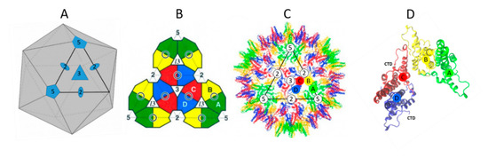 NTD alone can undergo self-assembly, forming a shell with two different icosahedral symmetries, namely T = 3 (minor assembly product 5%) or T = 4 (major assembly product 95%) (Figure 4) [31]. T = 4 means that the capsid is composed of 60 asymmetric units each made of two dimers of proteins (A–B and C–D), for a total of 240 capsid proteins per particle (Figure 4A–C). In the capsid formed of 240 monomers (T = 4), two dimers adopt an asymmetric orientation around the fivefold and twofold axes that triggers the formation of an icosahedral capsid (Figure 4D) [24]. Interestingly, the NTD structure exhibits large pores going from the outer to the inner layers that are about 12 to 25 Å in diameter depending on the axes from which they are observed in the icosahedral NTD capsid, by either X-ray [24] or cryo-EM [32,33,34] (for a review, [23]).