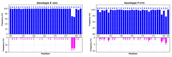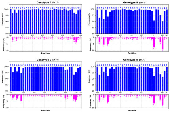 Conservation of the CTD amino acid sequences of the most prevalent genotypes. CTD sequences were extracted from the HBV database at Institut de Biologie Physico-Chimie (IBCP) IBCP (Lyon, France, https://hbvdb.ibcp.fr/HBVdb/). Numbers in parentheses correspond to numbers of analyzed sequences. Blue histograms correspond to overall conservation of residue at each position of the consensus sequence presented at the top of the graph. Pink histograms correspond to the most frequent substitution found in sequence alignment. Note that the genotype A CTD possesses two extra amino acids. Vertical axes represent frequencies of amino acid residues, expressed as percentage of conservation. In blue histograms, the axis was normalized between 80 to 100%, while in pink histograms, the axis was normalized between 0 to 10%, except for genotype E.