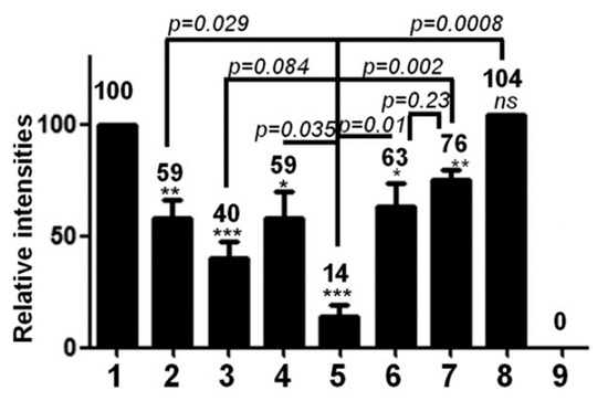 Not all S or T phospho-acceptors are phosphorylated at the same time. This histogram represents the relative intensities of phosphorylated HBc and HBc derivatives. Huh7 cells were transfected with a plasmid expressing wt HBc or HBc derivatives, where S or T were replaced with A and incubated with [32P] orthophosphate. (1) wt HBc STSSSS corresponds to the wild type (see Figure 2, numbers in brackets), (2) All serines were substituted for A while T162 was not (mut. ATAAAA), (3) S170 was maintained (mut. AAASAA), (4) S178 was maintained (mut. AAAAAS), (5) All phospho-acceptors were substituted for A (mut. AAAAAA), (6) S157, 164, 172 were substituted for A (mut. 3A-PRRR), (7) T162, S170 and S178 were substituted for A (mut. RRR-3A), (8) T162 was substituted for S (mut. SSSSSS), (9) pcDNA as control. Two days post transfection, HBc was immune-precipitated with anti-HBc antibody, and loaded onto SDS-PAGE and autoradiographied. Note that the presence of a single S (wells 3 and 4) or T (well 2) is enough for an efficient phosphorylation of HBc proteins. These results suggest that in the wt HBc only a few potent phospho-acceptor sites are phosphorylated. Modified from Figure 2B of [50] (IDccc: 1035507-2). Asterisk symbolizes a statistical difference between two samples.