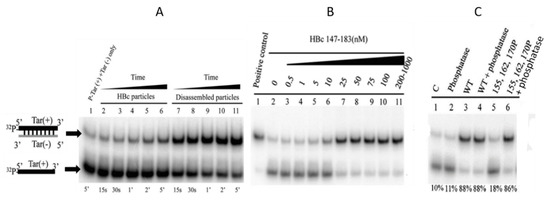 HBc and HBc (147–183) nucleic acid chaperone activity. (A): Tar(+)/Tar(−) duplex formation by assembled and disassembled capsids. (B): Tar(+)/Tar(−) duplex formation mediated by HBc (147–183) peptides. (C): Phosphorylation modulates Tar(+)/Tar(−) duplex formation. Tar(+) and Tar(−) were incubated with: Line 3, UP-HBc (147–183); Line 4, HBc (147–183) treated with protein phosphatase; Line 5, P-HBc (147–183) at positions S 155, 162 and 170; Line 5, P-HBc (147–183) at positions S 155, 162 and 170 treated with protein phosphatase. Panels A, B and C were respectively derived from Figures 1, 3 and 5 of [79] (IDccc: 1035507-1).