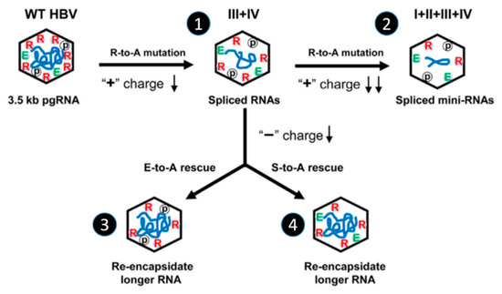 A subtle charge balance is required for RNA packaging. ARDs were mutated (R substituted for A) to reduce the positive charges and the status of packaged RNA is schematically shown by the blue line (pgRNA, 2.2-kb spliced RNA, 1.5 spliced mini-RNA). III + IV corresponds to HBc proteins where R165, 166, 173 and 174 of the third and the fourth ARDs were substituted for A. I + II + III + IV corresponds to HBc protein where R151, 153, 157, 158, 165, 166, 173 and 174 of all ARDs were substituted for A. The lower amount of positive charge of III + IV can be rescued by E–A or S–A substitution. This result suggests that the relative ratio of positive to negative charge appears more important than the quantity of either positive or negative charges for RNA packaging. Extracted and modified from Figure 7 of [53] and published under a CC BY 4.0 license.