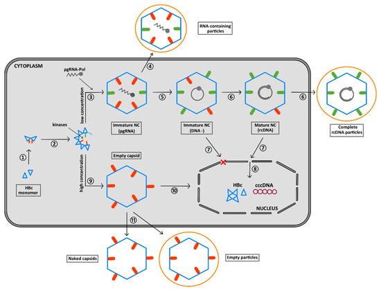It is likely that, at this stage of the viral cycle, two assembly pathways could be distinguished. The first assembly path occurs at a low concentration of HBc, where a subpopulation of unphosphorylated dimers (UP-HBc in green) specifically interact with pgRNA (Figure 10, ③) [40]. When pgRNA translation takes place on the polysome machinery, Pol and HBc are synthesized at the same time, greatly facilitating local RNA–protein interactions mediated by their respective high-affinity binding sites [40,89,113,114]. This results in the specific packaging of the viral RNA in a replication-competent capsid [115]. Consistent with this view, pgRNA serves as a platform directing the HBc–HBc interactions and condensation necessary for capsid completion [116]. Even though RNA-containing particles could be secreted [11] (Figure 10, ④) it is likely that, concomitant with capsid formation, RT, assisted by the nucleic acid chaperone activity of HBc, starts the synthesis of the (-)cDNA strand (Figure 10, ⑤) [72,79]. The formation of dsDNA (rcDNA), also referred to as the maturation process, increases the number of negative charges. This induces a repulsion of the P-CTD (red bars) [34,64,85] that is then exposed to the surface of the capsid thanks to the flexibility of the linker [42,110] and to the multiple holes in the capsid shell [24,32,33,34,84,94] (Table 1). Alternatively, taking into account that CTDs are heterogeneously phosphorylated, it is possible that a population of P-CTDs remains outside of the capsid during assembly and, conversely, only the UP-CTD ones, interacting with the pgRNA, remain within the capsid. Regardless of the model, mature viral particles are characterized by the exposure of several P-CTDs extruded out of the capsid that might be partly dephosphorylated (green bars), in agreement with the unphosphorylated status of complete secreted virions (Figure 10, ⑥) [56,95,96]. For non-secreted particles, their phosphorylated nuclear localization signal (NLS) located in the CTD is then used to dock mature (or immature) capsids on nuclear pores (NPCs) (Figure 10, ⑦) of the nuclear envelope, notably through the importins α and β [107], where only the mature capsid is disassembled [22] (Figure 10, ⑧). The brittleness of the maturated capsid induced by the rigidity of the DNA [41,85] and its phosphorylation status would direct particle dissociation so as to release the viral genome into the host cell nucleus [52,94,117], where cccDNA formation occurs, establishing chronic infection [8]. The second assembly pathway could occur at higher protein concentrations as an RNA-independent assembly pathway (Figure 10, ⑨). The gradual increase in protein concentration compensates for the weak protein–protein interactions [63], allowing the formation of large amounts of empty P-HBc particles [96]. Such empty capsids with exposed and phosphorylated CTDs (Table 1) can then be transported to the nucleus [22,105] but through an importin-β-dependent pathway (Figure 10, ⑩) [118] or secreted as naked or enveloped particles (Figure 10, ⑪) [11].