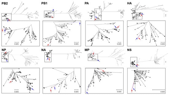 Reference sequences were downloaded from both the NCBI-Influenza Virus Resource (https://www.ncbi.nlm.nih.gov/genbank/) and Global Initiative on Sharing All Influenza Data (GISAID; http://www.gisaid.org). Nucleotide homology analysis was compared by BLAST search of the NCBI and/or GISAID databases. The phylogenetic relationships with reference sequences of eight gene segments (polymerase basic 2 (PB2): 2313 nucleotides (nt), polymerase basic 1 (PB1): 2288 nt, polymerase acidic (PA): 2199 nt, HA: 1705 nt, nucleoprotein (NP): 1532 nt, neuraminidase (NA): 1425 nt, matrix (M): 1001 nt, and NS: 864 nt) were determined by alignment using MUSCLE and edited with Molecular Evolutionary Genetics Analysis Version 6.0 (MEGA6) [19]. Rooted phylograms were prepared by the maximum likelihood method with 1000 bootstrap replicates for each gene using MEGA6 software.