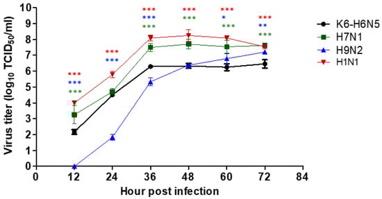 In vitro growth properties of H6N5 in MDCK cells. Viruses were inoculated into MDCK monolayers at a multiplicity of infection (MOI) of 0.01. The supernatants were collected at different time points: 12, 24, 36, 48, 60, and 72 hours post infection (hpi). Viral replication titers were determined by TCID50 assay. *, p < 0.05; **, p < 0.01; ***, p < 0.001.