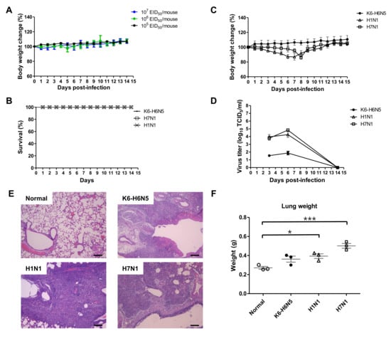 Six-week-old female BALB/c mice were purchased from Orient Bio (Seongnam, Gyeonggi, Korea). Each group of 16 mice was inoculated intranasally (i.n.) with 105 EID50/50 μL of K6-H6N5, H1N1, or H7N1 strains [12]. For the K6-H6N5 group, 105, 106, and 107 EID50/50 μL were inoculated. Anesthesia was conducted with isoflurane, following manufacturer’s instruction (Hana Pharm Co. Ltd., Hwasung, Korea) under the guidelines of vertebrate animal research, the University of Iowa [23]. Three mice per group were sacrificed at 3, 6, and 14 days post infection (dpi), and the virus titer in lung was determined thereafter. Ten mice per group were monitored for weight change, morbidity, and mortality, each day for 14 days post infection. This study was approved by the Animal Ethics Committee of the Wonkwang University (WKU19-64), December 19, 2019 and all methods were performed in accordance with the relevant guidelines and regulations. At 6 dpi, lungs from three mice were placed in 10% formalin/saline for studying pathology. Tissues in 10% formalin/PBS were processed and embedded in paraffin. Lung sections were cut at 4–5 μm from paraffin embedded lung tissues and mounted on glass slides. Histological characterization was analyzed using standard hematoxylin and eosin (H&E) staining and light microscopy (magnification ×100).