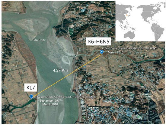 This hypothesis was supported by records acquired by the National Institute of Biological Resources from two different satellite tracking devices (br1691 and br1692) monitoring the movement of bean geese during January to November 2017 in Korea. According to the data, in the summer, the bean goose migrated to Russia (near Alaska) from Korea and returned to Korea in November 2017. Furthermore, the migration pattern of the bean goose, with the br1691 device attached, corresponded well with the isolation site identified for K17 during October–November 2017 (Figure S8A), while that of the K6 virus corresponded to the migratory path of the bean goose with br1692 attached, in November 2017, i.e., four months prior to the isolation of K6 in this study (Figure S8B). This data, therefore, supported the theory for possible reassortment of North American-origin virus in Russia, near Alaska, and potential transmission of the K17 virus from a bean goose to mandarin duck during the summer months, before they are returned to Korea, or possible reassortment via cross grouping within Korea (Figure 5B).