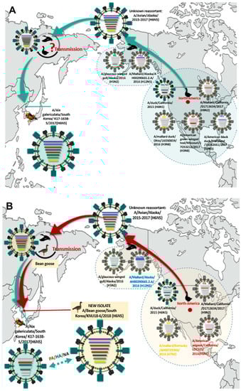 The main reason underlying viral dispersal over long distances is likely the overlap of flyways of wild migratory birds, which happen to be the major hosts for AIV. Particularly, four flyways (East Asian–Australasian, West Pacific, Pacific Americas, and Mississippi Americas) intersect at the boundary of the Eastern and Western hemispheres, near Alaska, causing an extensive diversity of Eurasian and North American bird species to be found in this area during spring and fall migrations [3]. Certain key vector bird species, such as green-winged teal (Anas crecca), mallard (Anas platyrhynchos), and northern pintails (Anas acuta), have been reported to carry viruses containing genetic divergence of both Asian and North American species, showing a high prevalence of group HA-1, 3, 4, 5, 6 and NA-1, 2, 6, 8 during the 2006–2008 surveillance in Alaska [4,5,6].