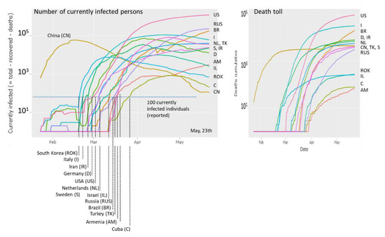 Covid-19 cases (left plot: currently infected, right plot: died individuals) in different countries as a function of date. The ‘100-cases per country’ threshold is crossed between end of February and end of March for the countries shown (except China). The time courses reflect growing (e.g., US, RUS, NL), slightly decaying (e.g., I, D, TK), strongly decaying (e.g., CH, ROK) regimes of epidemic or indications of bi-or multiphasic growth (e.g., AM, IR). The courses of the dead toll as a function of time reflect country-specific percentages of Covid-19 victims. The plots were generated in the Corona-viewer on a daily actualization-basis as described in the text.