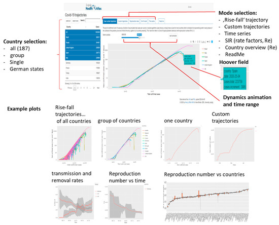 Covid-19 viewer: Screenshot with major functionalities indicated (above) and example plots (below).