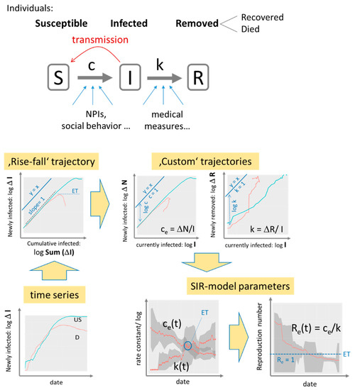 SIR model analysis: The SIR model assumes a sequence of three disease states (S, I, R, S + I + R = N, N population size) and transitions between them. Transmission and removal rates (numbers per day) are quantified in terms of the rate constants c and k, respectively. The time series of infected cases transforms into trajectories, which show daily changes of infected and removed cases as a function of cumulated or current infections in double logarithmic scale. Exponential growth is indicated by slope of unity while the transmission and removal rate factors refer to the vertical distance between the respective trajectory and the diagonal line (y = x). A downwards curved trajectory indicates decreased growth or eradication of epidemic (slope < 0) with the epidemic threshold (ET: slope = 0) indicating stop of epidemic. Values of the factors ce and k and of the reproduction number Re are plotted as a function of date as running averages over a sliding window of seven days (the running standard deviation is shown as grey uncertainty strip). Example data are shown for Covid-19 case numbers in Germany (D, red curves) and USA (US, blue) from 27 April 2020. See text and Supplementary File, Appendix I and II for details.