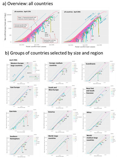 Detailed inspection of the trajectories of sets of countries grouped roughly by size and geographic region reveals further details (Figure 4b, compare with Figure S4 in Supplementary File showing the respective trajectories recorded at April 29). Most Western European countries of larger and medium size reached the decaying part in the first week of April 2020 (except Sweden and Great Britain) roughly two-three weeks after NPIs were taken in these countries. Countries from different parts of the world such as Austria, Iceland, South Korea, Australia, New Zealand and China reached low levels of new infections as indicated by strong vertical decays. Larger countries (e.g., Russia, India, Brazil, Pakistan, India) were in the rising part. Some countries show a two-phase growth as indicated by the parallel right shift of linear regions in their growing part (e.g., Sweden, Denmark, Iran, Ukraine, Armenia) indicating that fast exponential growths are followed by slower phases due to reduced transmission rates (see below). Singapore and Japan show relatively slow growth phases with reduced rates and late turns into falling regimes while South Korea’s turn is very sharp, presumably because of the ‘crash down’ measures taken there.