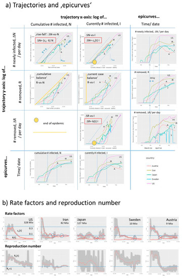 In Supplementary File we can find analogous differences between Western and South European countries (E, F, I, Figure S3) compared with Middle European ones (D, A, CH), which suggest differences in the spread mechanism of Covid-19 and, possibly, also in the recovery dynamics. The removal rate obtained depends on the time-delay between infection and recovery [30], which is neglected in our simple trajectory-approach (see also epicurves in Figure 5a). ‘Cumulative balance’ and ‘current case’ custom trajectories complete the visualization options: Lower levels of transmission and removal rates associate with trajectories running closer to the diagonal. Overall, the trajectories enable tracing an epidemic in terms of case numbers reported directly be the census agencies of the respective countries. Derived numbers such as the rate factors and reproduction numbers ‘translate’ these numbers into features more directly describing the dynamics of the epidemic.