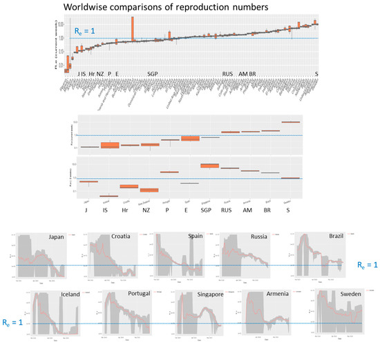 Effective reproduction numbers as shown in Figure 5b provide suitable summary measures of the case numbers with a well-defined epidemiological meaning. Their value defines the transmission potential in the population in terms of the mean number of individuals who are infected by one infectious person on the average. For the comparison of all or a selection of the countries, the monitoring tool generates a ranked boxplot of reproduction numbers. In roughly 50% of all countries Re is still larger than unity meaning that epidemic is not stopped (Figure 6).