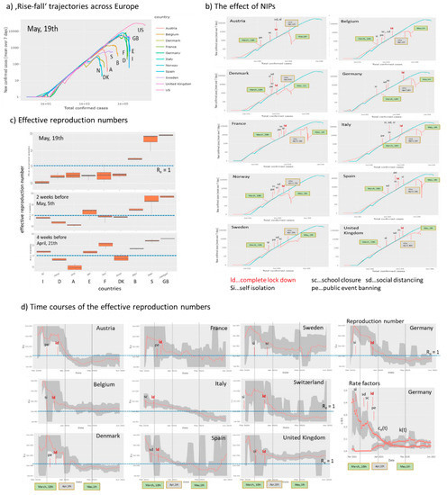 The NPIs were taken in Middle and Western Europe and Scandinavia in the first three weeks of March 2020. Next, we asked how these measures affected the dynamics of the epidemic. The rise-fall trajectories of countries selected from [12,31] reveal that they now are mostly in the falling regime however with modifications such as parallel downwards shifts, wave-like decays and even lacking decays as already discussed above (Figure 7a). In Figure 7b we replot the trajectories separately for each country together with marks indicating which measure was taken when along the trajectories. In most cases, trajectories start turning downwards about two weeks after a complete lockdown in the respective country. Before this, one often finds slowing down of the exponential growth as indicated by small differences compared with the trajectory of US referring to exponential growth. In Norway, Denmark, and also Sweden one observes a relatively strong first slowing down as indicated by the parallel downwards shift of the trajectories, which roughly refers to a reduction of the transmission rate constant by about 30% (Figure 7d). Sweden, without complete lockdown measures, but also Great Britain show the weakest decay of the trajectories and largest values of the effective reproduction numbers Re > 1 in contrast to all other countries except Belgium (Figure 7c). Comparison of the reproduction numbers two and four weeks earlier indicates high values in Britain and Sweden and also a delayed decay in Italy, Spain and France. These countries were heavily hit by Covid-19 in February and March. The time courses of the reproduction numbers Re(t) respond on the measures in many cases showing, at least, small drops in support of a recent study [12], which assumes that the reproductive number—a measure of transmission—immediately responds to interventions being implemented (Figure 7d, the first measure and complete lockdown were indicated). Consistent decays to values Re < 1 after about two weeks were seen in Scandinavia (except Sweden) and Austria, Switzerland and Germany while in Belgium, France, Italy and Spain the decays last roughly four weeks until they fall below the epidemic threshold. In Sweden and Great Britain, virtually unchanged levels of Re above the ET were observed. A recent model analysis of the effect of NPIs in Germany applies a SIR model with changed rate constants at so-called ‘change points’ which are assumed to take place when measures were applied [32]. School closures (‘sc’) were found as most effective in reducing reproduction numbers by about 50%, where ‘sc’ took place shortly before complete lock down in most countries [33]. We found a decay of the transmission rate by 60–70% during the time when measures were applied in rough agreement with [32] (Figure 7d, right part). Another recent reanalysis of the NPI-data across Europe used in [31] found that the different NPIs were introduced so closely in time during some weeks in March that makes identifiability of the effect of individual NPIs infeasible [34]. Interestingly, Japan showed a similar response to NPIs as the European countries. Namely a slow, but instantaneous growth of epidemic turned into the falling regime at the beginning of May (Figure 5 and Figure S7), two-three weeks after NPI measures were intensified at 10 April.