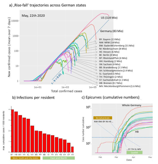 Covid-19 in Germany: (a) ‘Rise-fall’ trajectories across German states: The trajectories of German states resemble that of whole Germany indicating similar dynamics of Covid-19 across Germany. Trajectory of US is shown for comparison. (b) The relative maximum cumulative number of infected cases (per 1000 residents of the respective states divides clearly into states from West and South Germany and states in the East and North of Germany. City states (BE, HH, HB) are found in the former group. (c) Epi-curves (cumulative case numbers as a function of time) reveal that epidemic arrived earlier in Western and Southern states mostly by a few days compared with the Eastern and Northern ones. The curve of the city state Bremen (HB) slightly differs from that of the other ones.