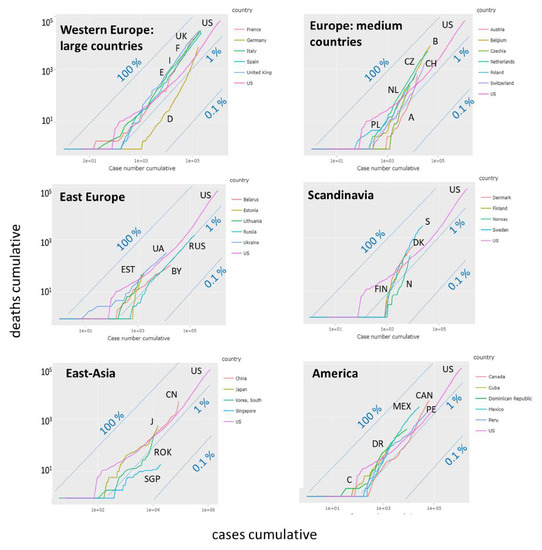 Mortality trajectories show cumulative number of deaths versus cumulative number of infections. The diagonal line (y = x) refers to 100%, parallel lines to 1% and 0.1% (number of deaths per 100 cases). The mortality trajectory of the US is shown in all plots for comparison.