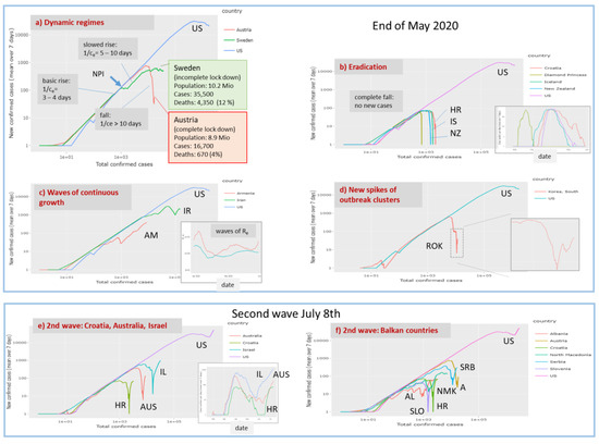 Example trajectories indicating different dynamic regimes of Covid-19: (a) Basic rise and falling regimes refer to transmission intervals of 3-4 and more than 10 days, respectively. They were observed in European countries under complete lock down such as Austria. Incomplete lock down as applied in Sweden only slowed down spread of epidemic. It associates with roughly two times more infections and a more than four-fold death-toll. (b) Eradication of epidemic can be expected in island states (Iceland, New Zealand) and other relatively small countries (e.g., Croatia) showing disappearance of new cases two to three months after the outbreak (see epi-curves in the insertion). Another example of eradication is Covid-19 spread at the Princess Diamond cruise liner with about 760 infections. (c) Wave-like up and downs of epidemic were observed in Armenia and Iran. The trajectories transform into wave-like oscillations of the effective reproduction number (insertion). (d) A new spike of cases is seen in the trajectory of South Korea. (e) The start of a 2nd wave becomes evident in the first week of July in selected countries, especially, (f) at the Balkan. The trajectory for US is shown for comparison showing also indications of a second wave.