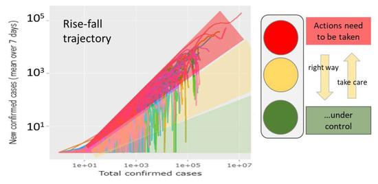 Traffic light dashboard for evaluating the state of the epidemic. The rise-fall trajectories provide the ‘phase-space’ of pandemic roughly dividing countries into ones that need to take actions, countries where epidemic is under control and countries that are at the right way if trajectory is falling or that have to take care if trajectory is rising (see also Figure S6).
