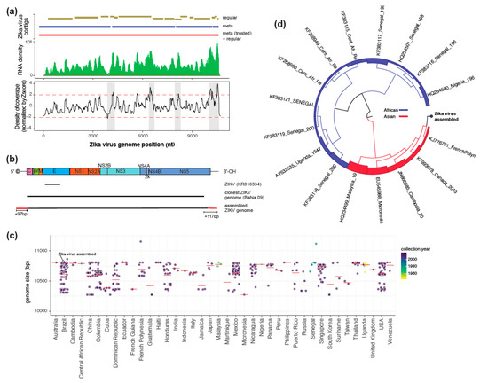Similarly, for the previous Zika virus strains derived from the outbreak in 2015, the viral strain assembled in this work clustered together with other strains with Asian genotype (Figure 1d). Comparative analysis among all complete sequences deposited at the VIPBRC database revealed that differences among viral genomes are mainly in untranslated regions, which is consistent with the literature [4,6,39]. Curiously, untranslated regions have been linked to differences in virulence of different arboviruses [4,40,41]. In addition, these regions are also suggested to be involved in other viral characteristics, such as host preference and tissue tropism [4,6,42]. This result highlights the need for achieving complete viral genomes to better our understanding of virus–host interactions.