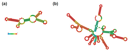 - Hofacker, I.L. Vienna RNA secondary structure server. Nucleic Acids Res. 2003, 31, 3429–3431. [Google Scholar] [CrossRef]
