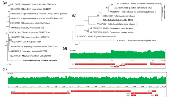 Characterization of viruses identified in the A. albopictus C6/36 cell line. Maximum likelihood phylogenetic trees of the (a) new strain of Alphamensonivirus and (b) new viral specie related to the Totiviridae family. RNA coverage of identified viral genomes are shown for (c) Alphamensonivirus and (d) Totivirus-like.