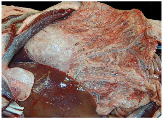 Upon gross examination, this sea lion had severe, diffuse steatitis with pleuritisperitonitis (polyserositis) characterized by abnormal white, pale tan to yellow, firm, and friable omental and mesenteric adipose tissue and roughened pleural, peritoneal, and serosal surfaces. The lungs were firm, pale tan and pink, and failed to collapse completely, consistent with interstitial pneumonia. The mediastinal and pericardial adipose were thickened, firm, pale tan and friable. as in the peritoneal cavity. The stomach and intestinal tract had multifocal mural thickening and the gastric and mesenteric lymph nodes were enlarged, firm, and tan. The kidneys, pancreas, salivary glands, and skeletal muscle had tan, firm, and coalescing foci indicative of chronic inflammation. Similar gross necropsy findings were noted in 11 other Csls stranding during along the CA coastline during the same six-month period with polyserositis and steatitis (Figure 1).