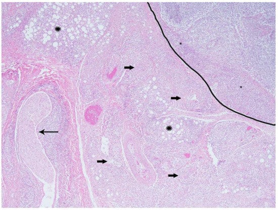 California sea lion, gastric lymph node and mesentery. The lymph node (outlined) has loss of normal cortical architecture with extensive mononuclear infiltrates in the subcapsular sinuses (asterisks). Some adjacent vessels (block arrows), nerve (arrow), and adipose tissues (starbursts) are surrounded and partially obscured by high numbers of mononuclear cells. Hematoxylin and eosin, 4× magnification.