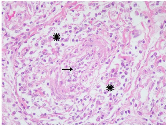 Histologic examination confirmed chronic inflammation in the thoracic (mediastinal and pericardial) and peritoneal (mesenteric and omental) adipose tissues (steatitis); lymph nodes; and various parenchymal organs, predominantly lungs, kidneys, and the gastrointestinal tract. Affected tissues were expanded and replaced by variably dense accumulations of macrophages and mononuclear cells amongst edematous, sparsely collagenous, and highly cellular (immature) to dense collagenous (mature) fibrous connective tissue (fibrosis) (Figure 2). Macrophages were large with abundant eosinophilic foamy cytoplasm, poorly defined cell borders, and large vesicular nuclei. Intermixed with macrophages were few to numerous lymphocytes, plasma cells, and neutrophils and occasional multinucleated giant cells (Figure 3). Small to medium-caliber blood vessels including arterioles and venules, had mild to moderate mural thickening with large smudged smooth muscle cells and mononuclear cell infiltrates with reactive endothelium (Figure 4). Pulmonary parenchyma, thoracic, abdominal, and to a lesser extent, peripheral lymph nodes, had partial to nearly complete effacement of normal architecture by similar histiocytic and mononuclear infiltrates with associated fibrosis. Renal interstitium, pelvices, capsule, and peri-renal fat were similarly affected as were the serosal surfaces of the gastrointestinal tract. Skeletal and cardiac muscle had myocyte degeneration and necrosis with surrounding macrophages, fibrosis, and large regions of dystrophic mineralization. The liver, salivary glands, endocrine glands, reproductive tract with gonads, and urinary bladder were similarly though lesser affected. Representative sections stained with various special histochemical stains including Gram, Giemsa, and Gomori’s methenamine silver revealed no causative agents including fungi, bacteria, and protozoan or metazoan parasites. Macrophages within the lesions did not contain ceroid pigments based on lack of autofluorescence and negative staining with Ziehl–Neelsen and periodic acid-Schiff (PAS), further indicating absence of fungal and mycobacterial infections [16].