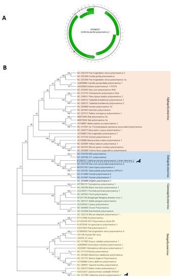 Phylogenetic analysis indicated that the virus belonged to the deltapolyomavirus clade and was most closely related to polyomaviruses infecting other carnivores (Figure 6B).