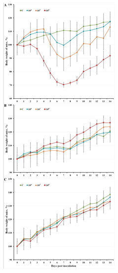 Changes in mouse body weight after intranasal (A), intradermal (B), and subcutaneous (C) inoculation with VACV LIVP-14 (doses of 106, 107, and 108 pfu) or saline solution (C, control). The error bars indicate the standard deviation of the mean of mouse body weight in each group consisting of six animals.