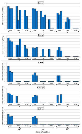 VACV concentration in the internal organs of mice intranasally infected with the LIVP-14 strain at doses of 106, 107, and 108 pfu. The data for individual animals on days 3, 7, and 10 post-inoculation (dpi) are presented. Organs of three mice were analyzed at each time point.
