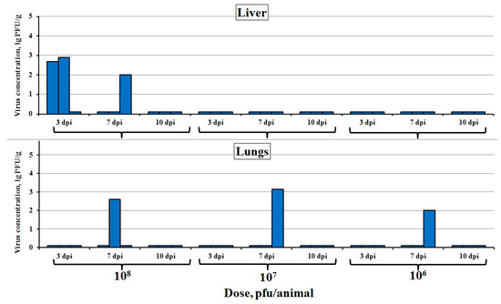 The i.d. injected virus at a dose of 108 pfu was detected in the liver in some animals on 3 and 7 dpi. In one-third of the animals, LIVP-14 was revealed in the lungs on 7 dpi for all three infective doses (Figure 3). After i.d. administration, LIVP-14 was not revealed in the samples of the other internal organs under study.