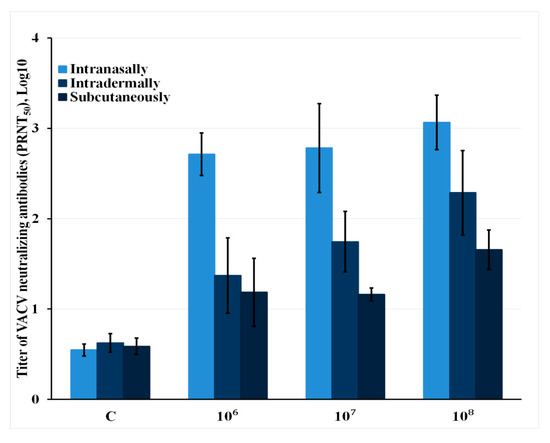 The data on VACV-neutralizing activity of serum samples collected on day 28 after the mice had been infected with different doses (106, 107, and 108 pfu) of the LIVP-14 strain via different routes. C (control)—serum samples from mice that received saline solution. The error bars indicate 95% lower and upper limits of the estimated titer. Each group consisted of six animals.